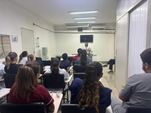 A enfermeira Márcia Samartino, supervisora do Gerenciamento de Leitos (NIR) e da Alta Responsável, apresentou aos futuros profissionais o funcionamento e a importância desses setores dentro do ambiente hospitalar. O gerenciamento de leitos é um dos pilares para garantir eficiência, fluxo adequado de pacientes e qualidade na assistência.