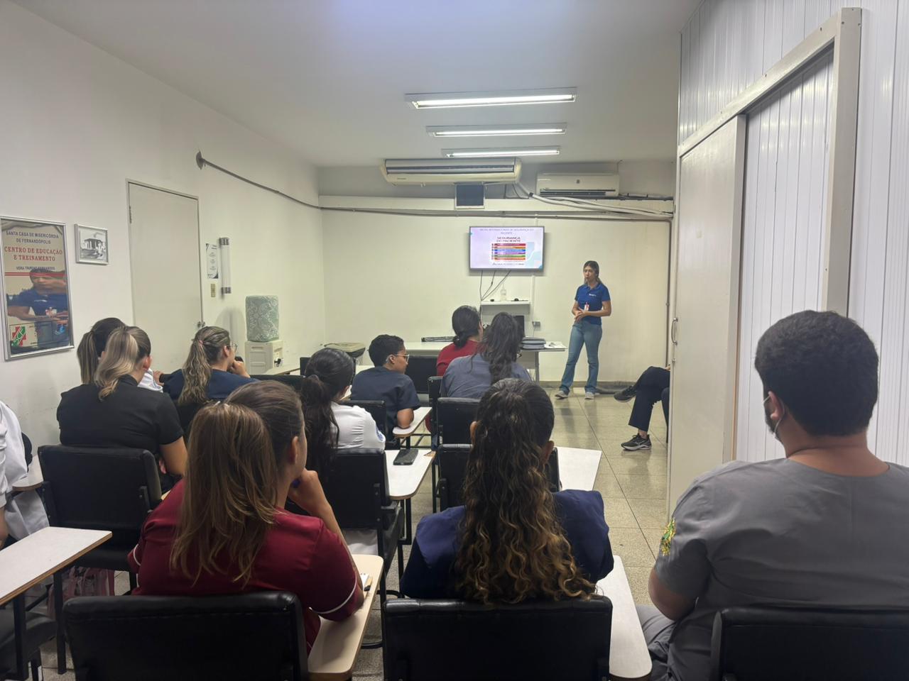 Na última quinta-feira (16), a Santa Casa de Fernandópolis abriu as portas da instituição para os alunos do 10º período do curso de Enfermagem, da Fundação Educacional de Fernandópolis (FEF), para uma palestra sobre fluxos de atendimento no hospital. As responsáveis pela visita foram as enfermeiras Márcia Samartino e Franciele Sgoti.